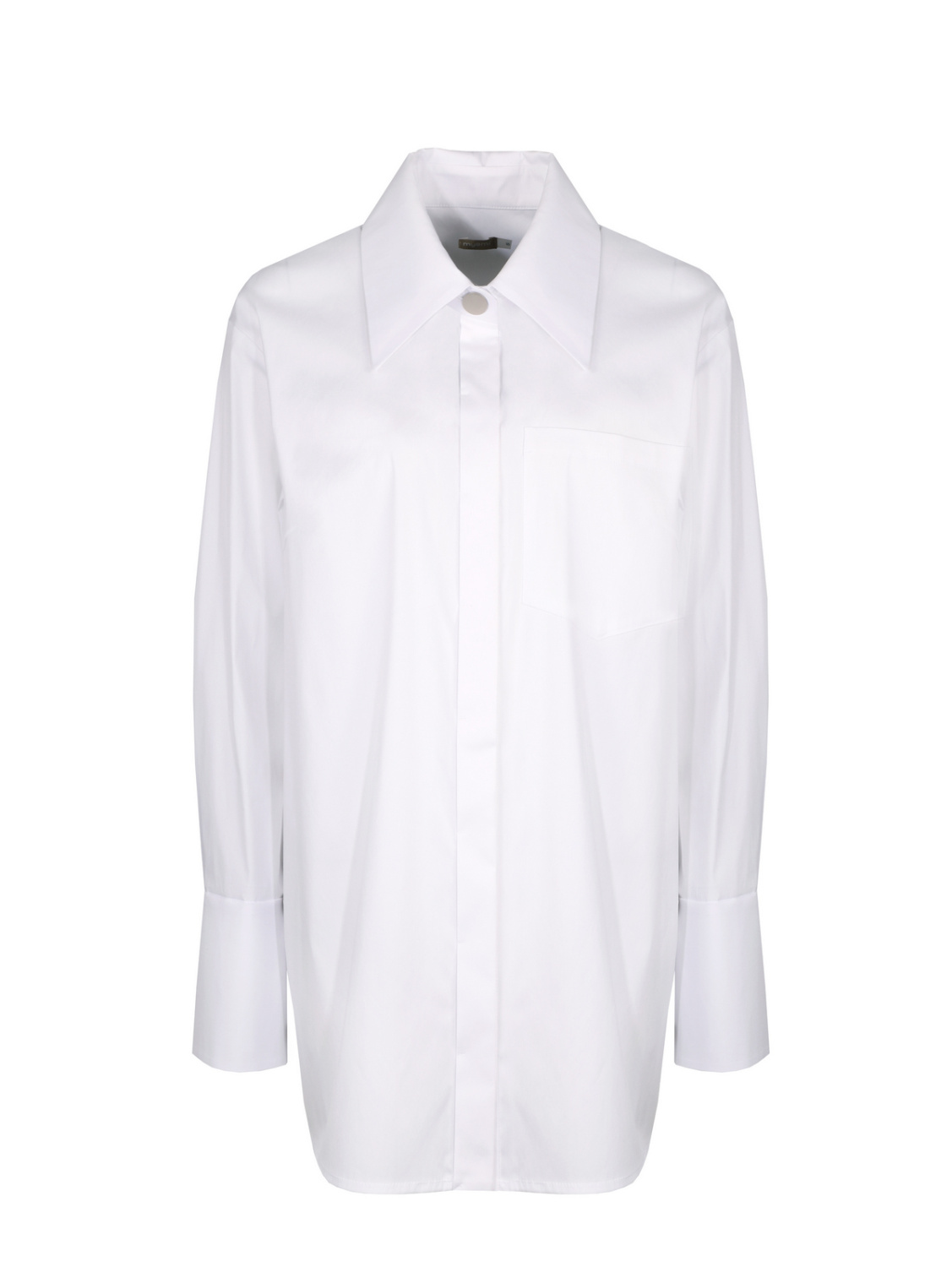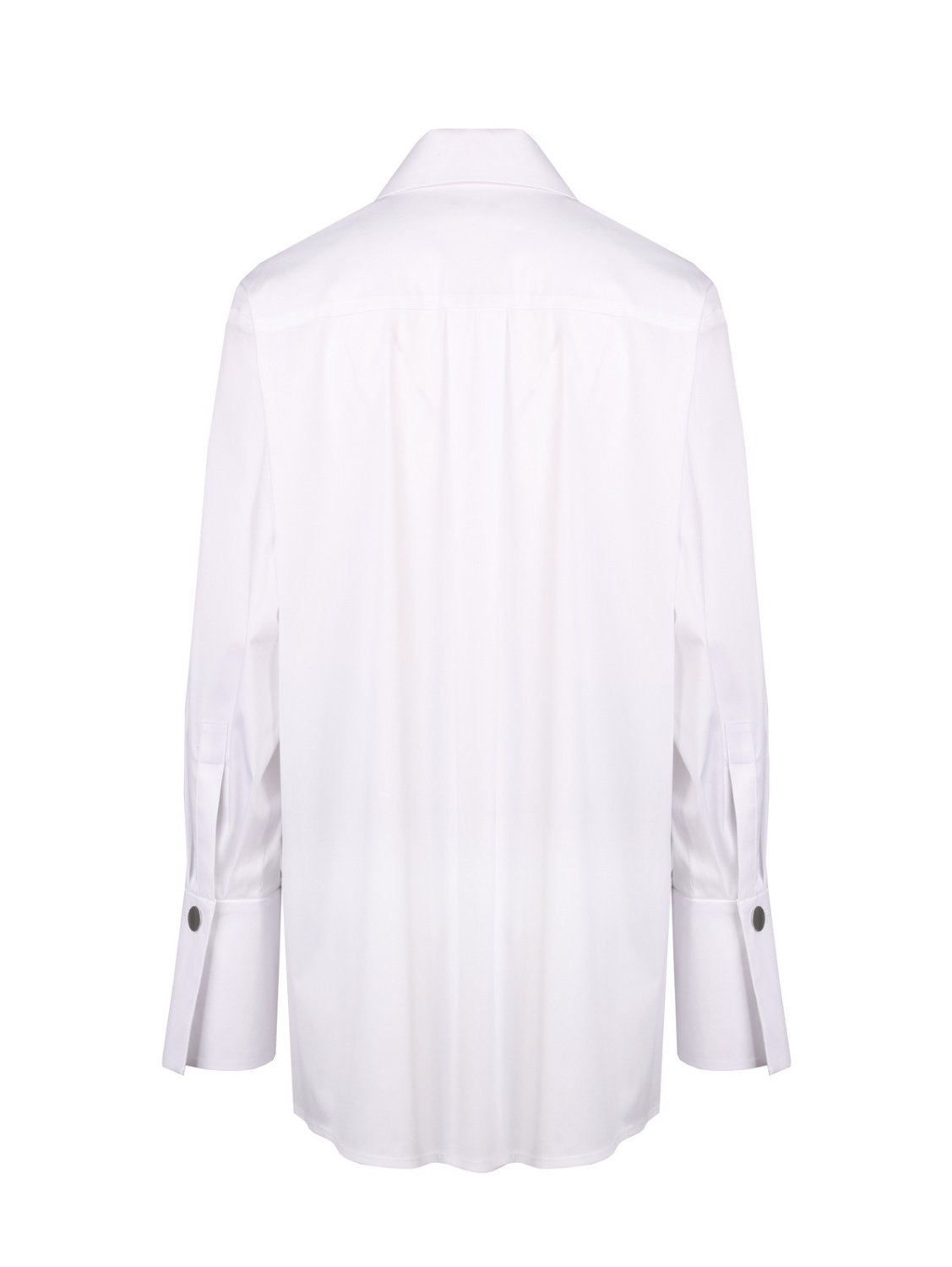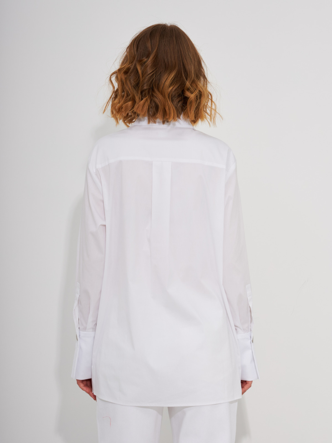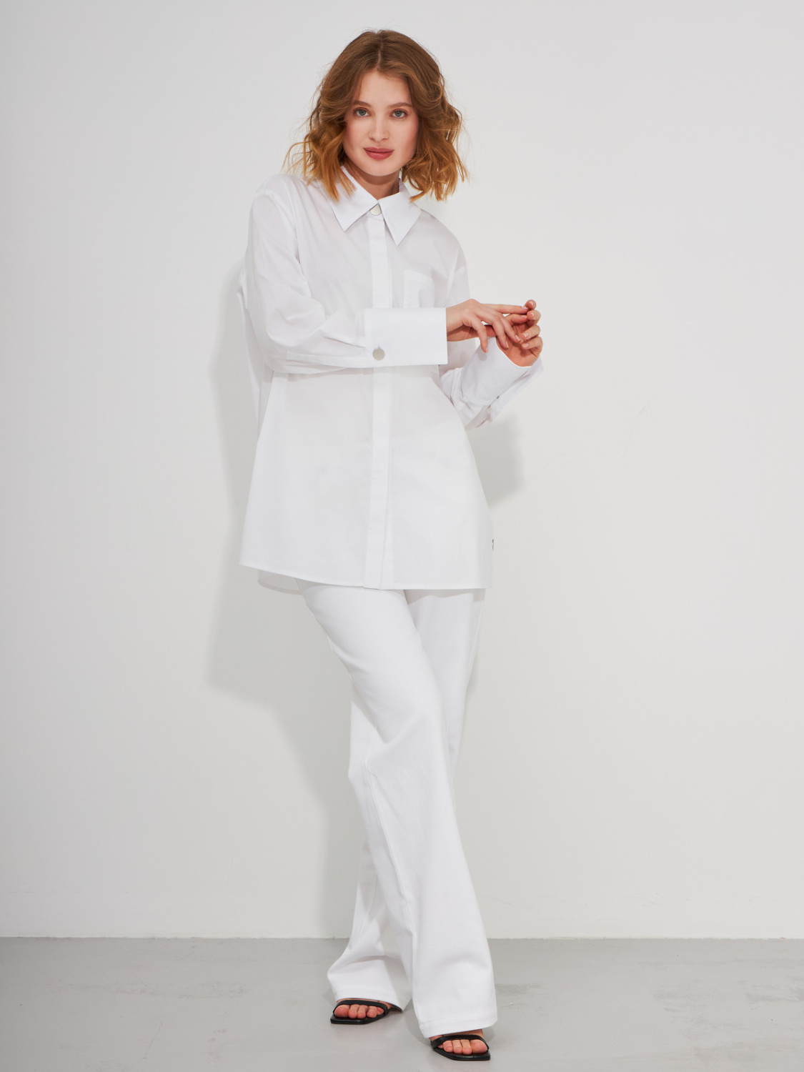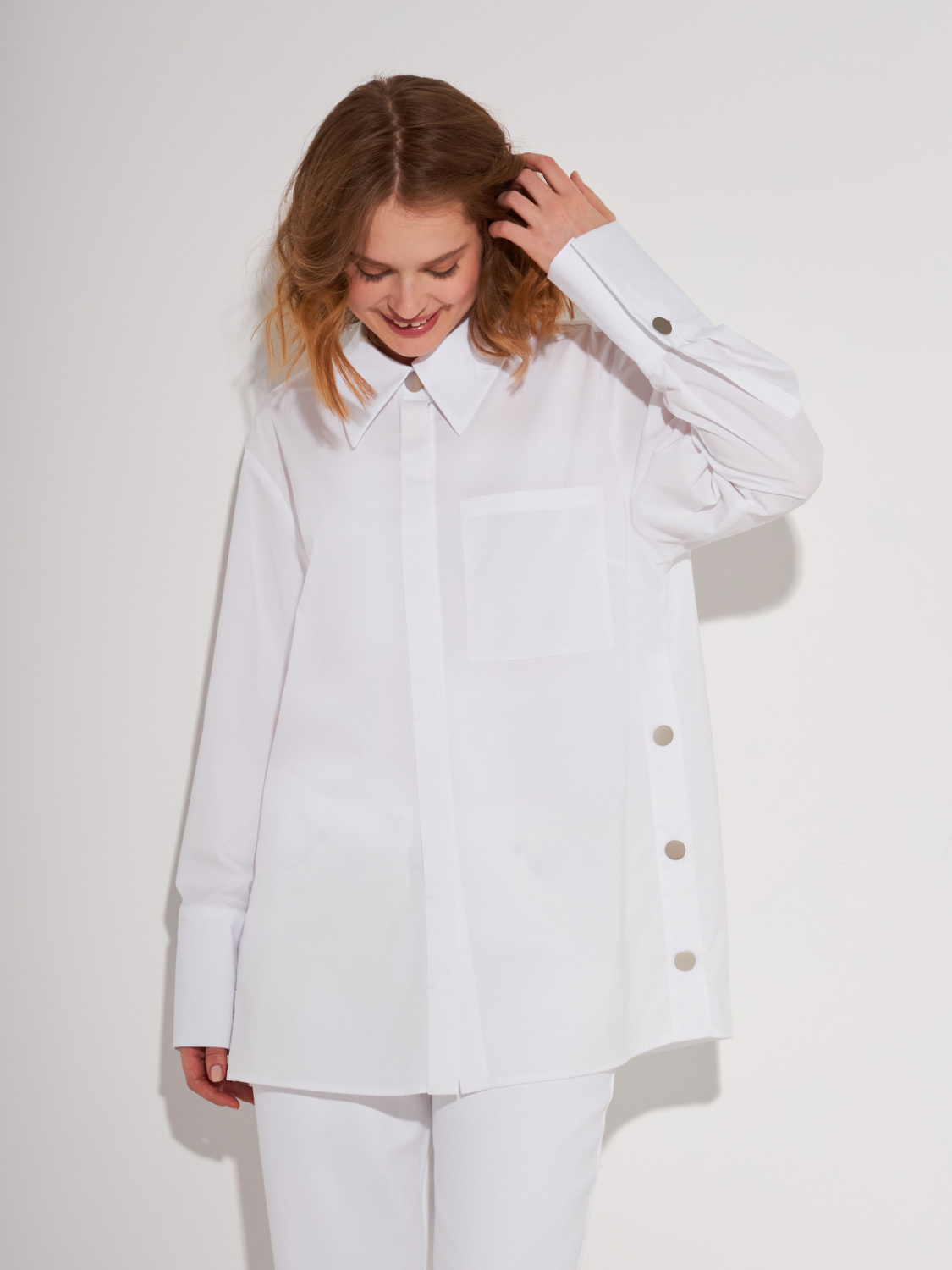Белая удлиненная рубашка станет базовой моделью в любом гардеробе. Материал с высоким содержанием хлопка отлично держит форму и пропускает воздух, что важно для комфортной носки. Акцентные пуговицы в боковых швах делают модель универсальной, позволяя стилизовать рубашку не только в формальном образе, но и в вечернем.