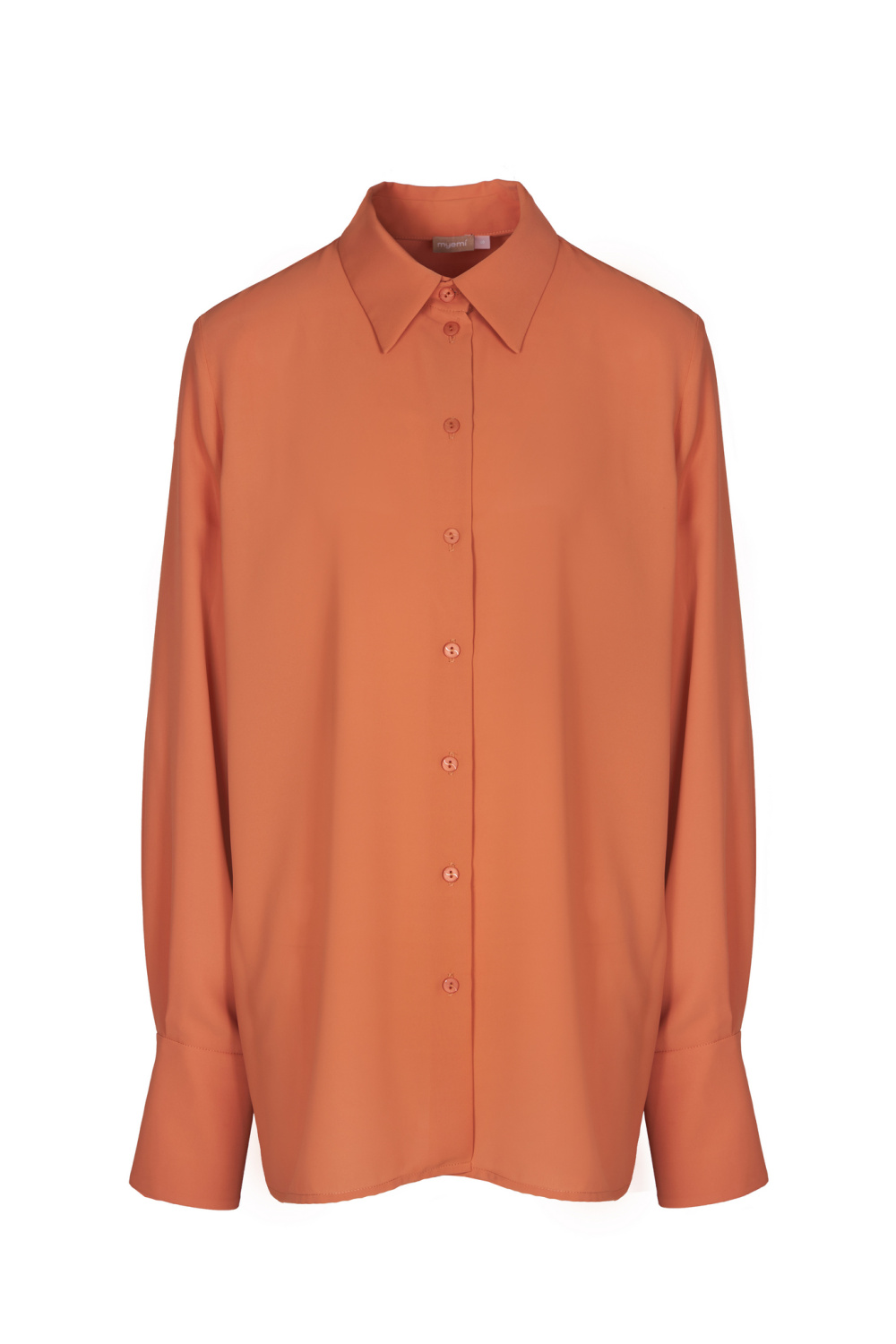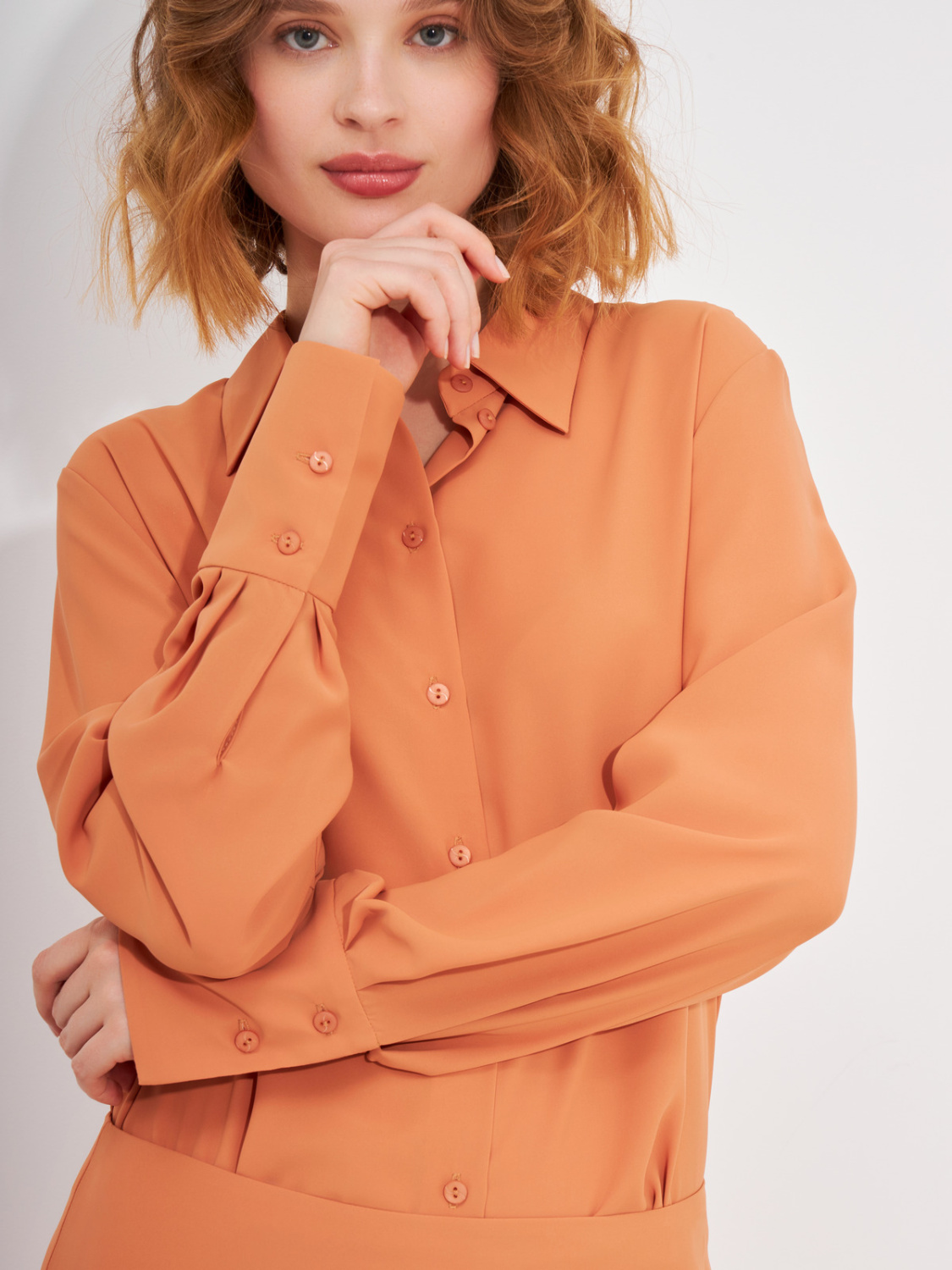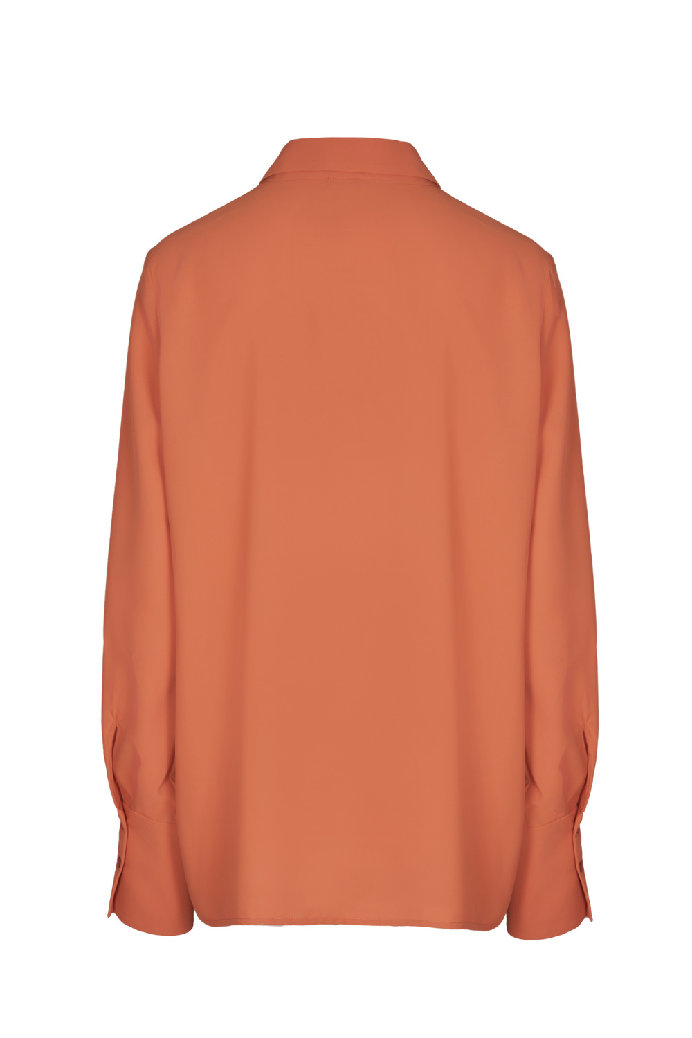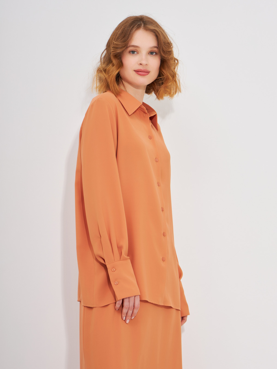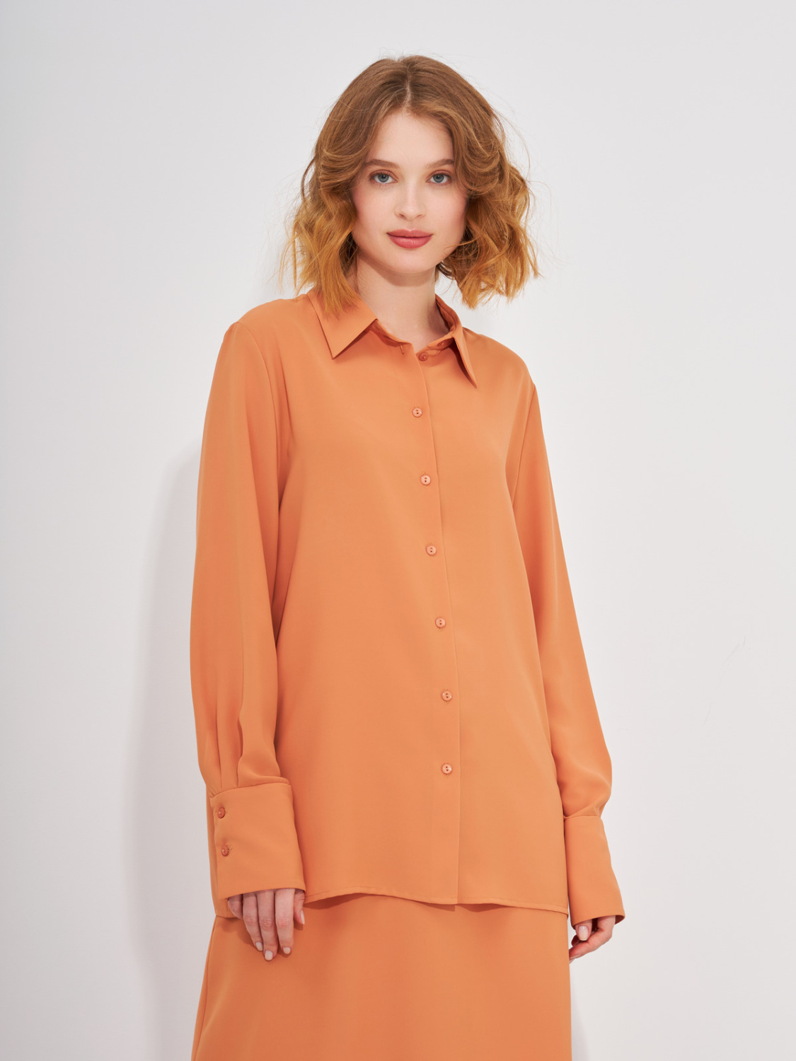 Струящаяся рубашка прямого силуэта в оранжевом цвете  впишется, как в формальный, так и в вечерний образ. Изделие выполнено из нежного и приятного на ощупь материала. Высокие манжеты на рукавах придадут образу элегантности, а вертикальная планка по переду вытянет силуэт.