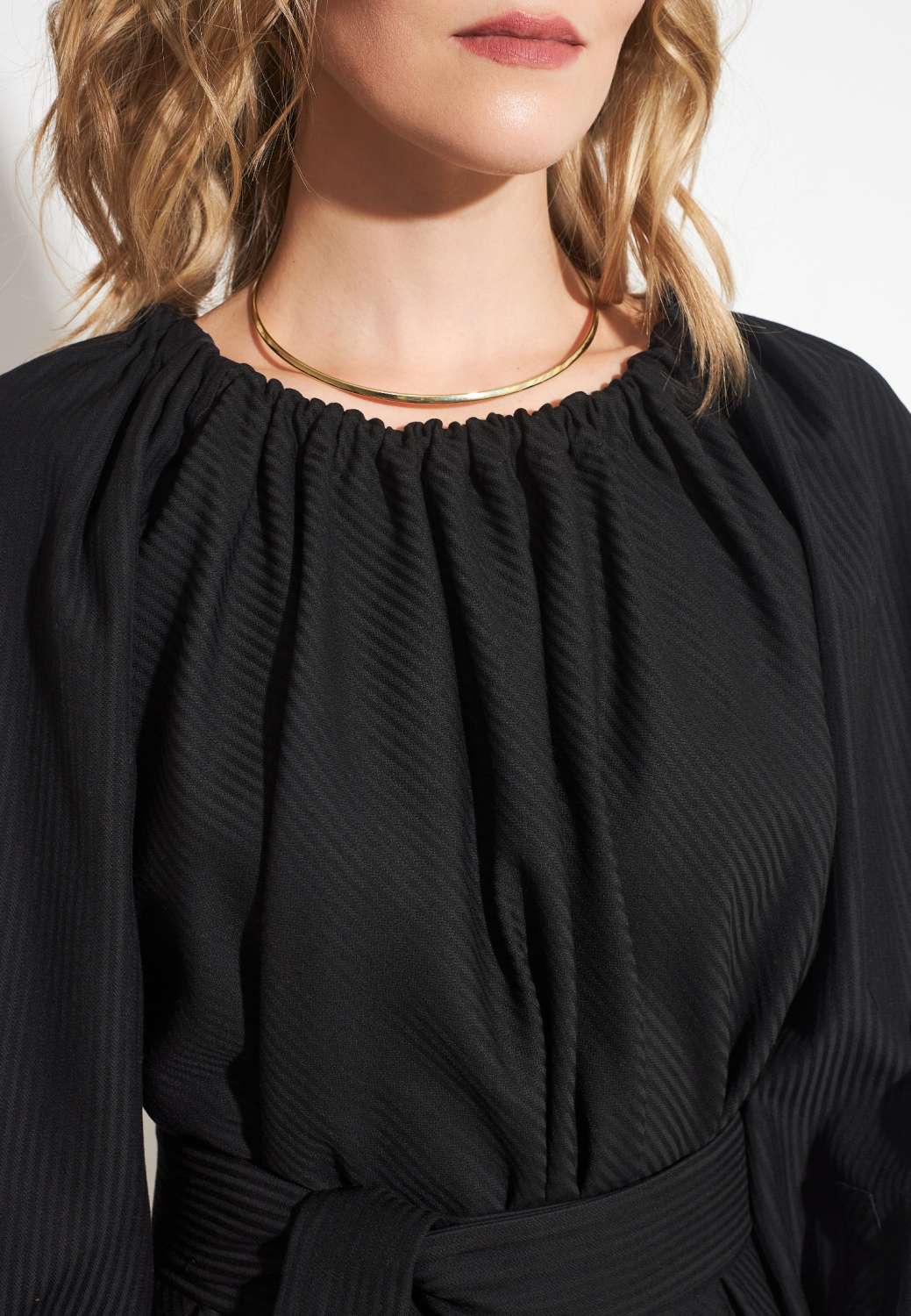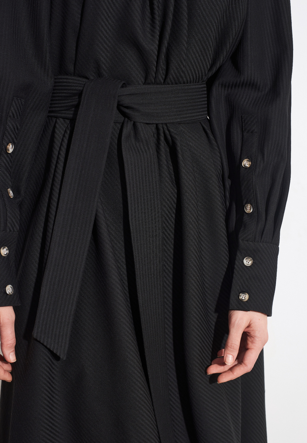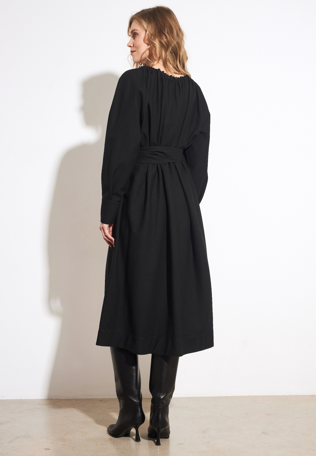 Платье с длинным рукавом идеально подойдет для повседневной носки.  Материал со 100% содержанием шерсти способен отлично сохранять тепло, при этом гигроскопичен  и пропускает воздух.  Эластичную горловину можно приспустить на плечи и подчеркнуть ключицы.