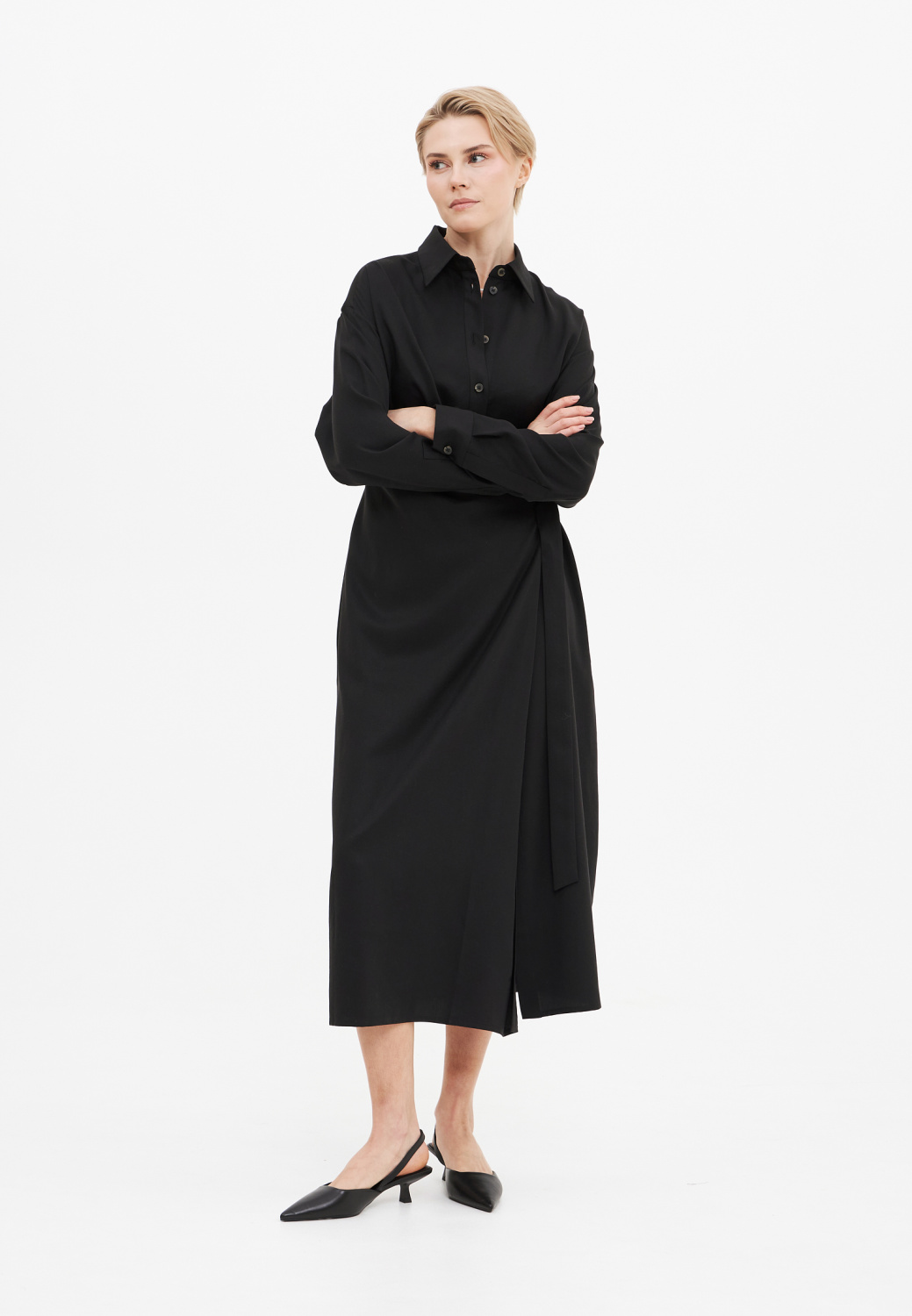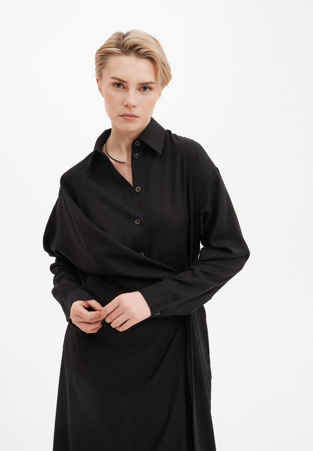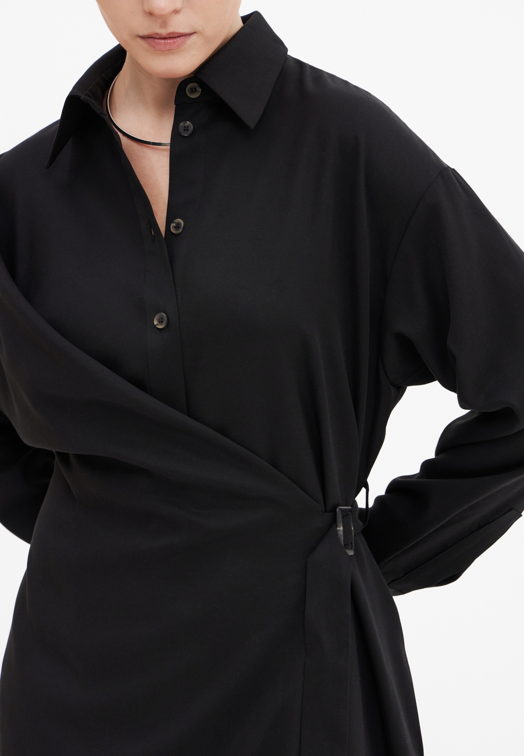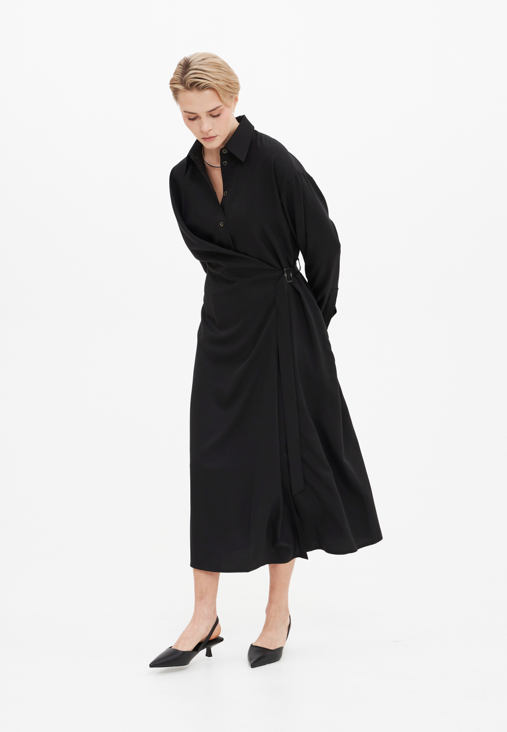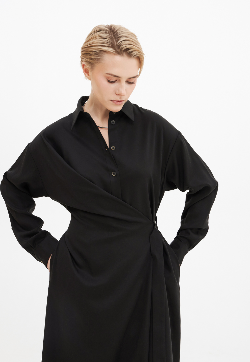 Платье прямого силуэта в черном цвете с асимметричным драпированным запахом сделает любой образ нарядным и элегантным. Модель в длине миди имеет ряд пуговиц, которые позволяют регулировать глубину декольте. Длинные рукава с манжетами застёгиваются на два ряда пуговиц, которые позволяют регулировать обхват запястья.