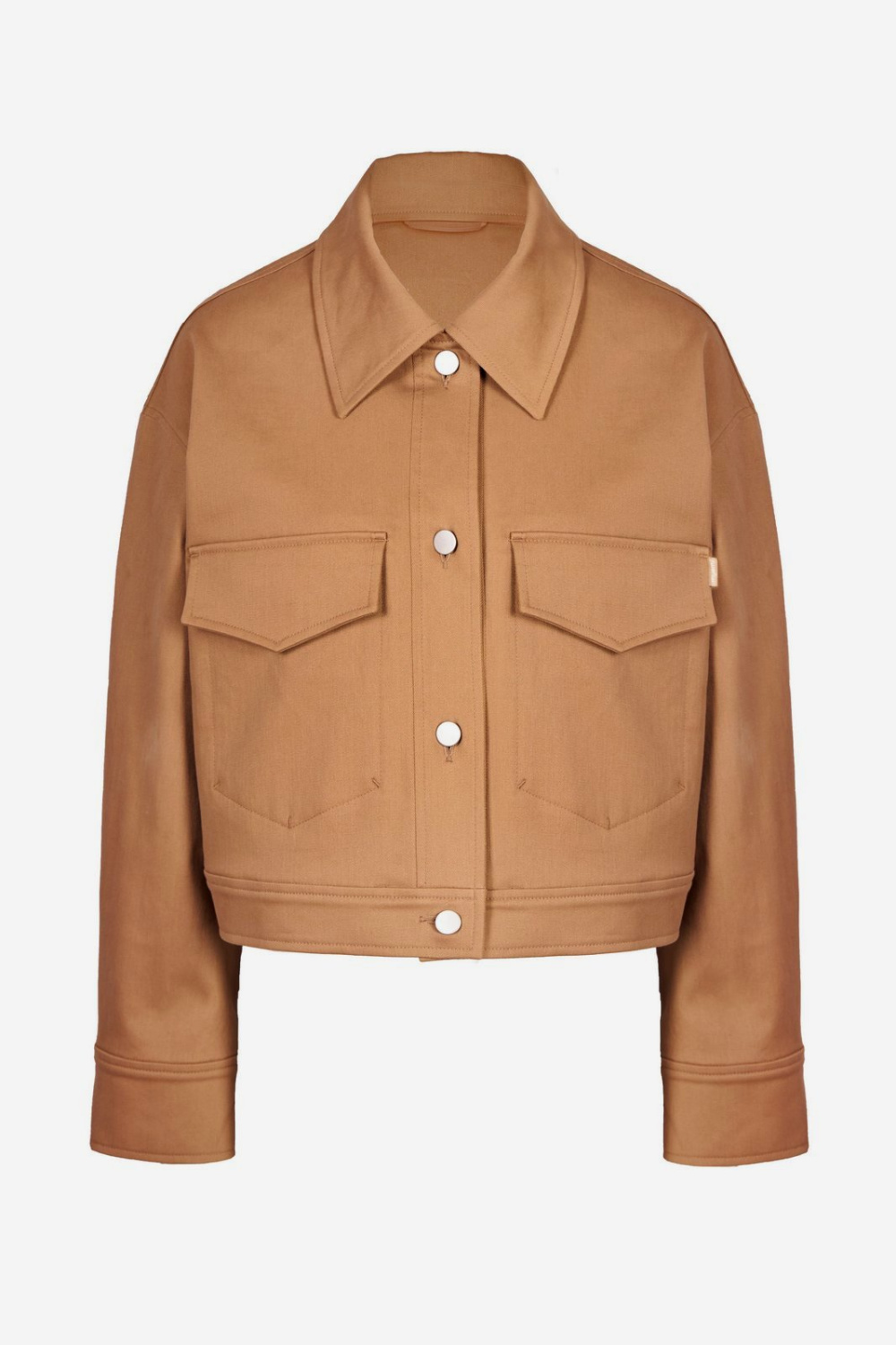 Укороченная куртка из итальянского хлопка деликатного коричневого оттенка.  Модель декорирована отделочными строчками по переду, имитирующими фигурные накладные карманы с клапанами на груди. Материал премиального качества на основе хлопка мягкий, прочный и устойчивый к износу. Модель прямого силуэта, с притачным поясом по низу, стояче -отложным воротником, втачным рукавом с манжетой и центральной застёжкой на петли и  джинсовые болты. Составит однотонный тотал-лук с юбкой того же оттенка.