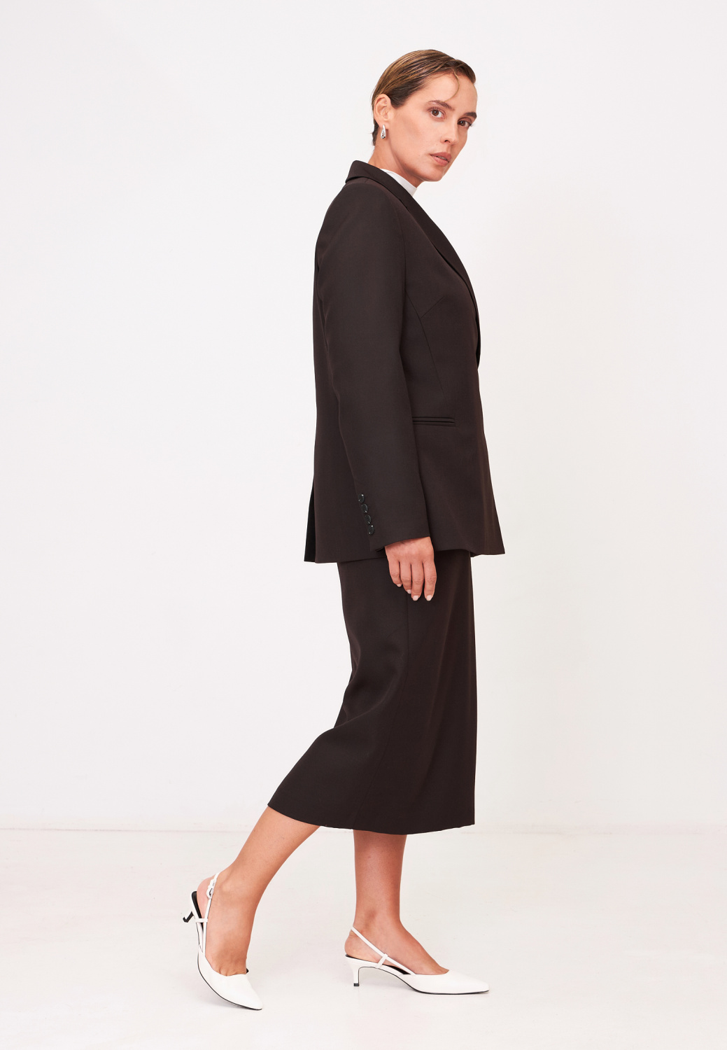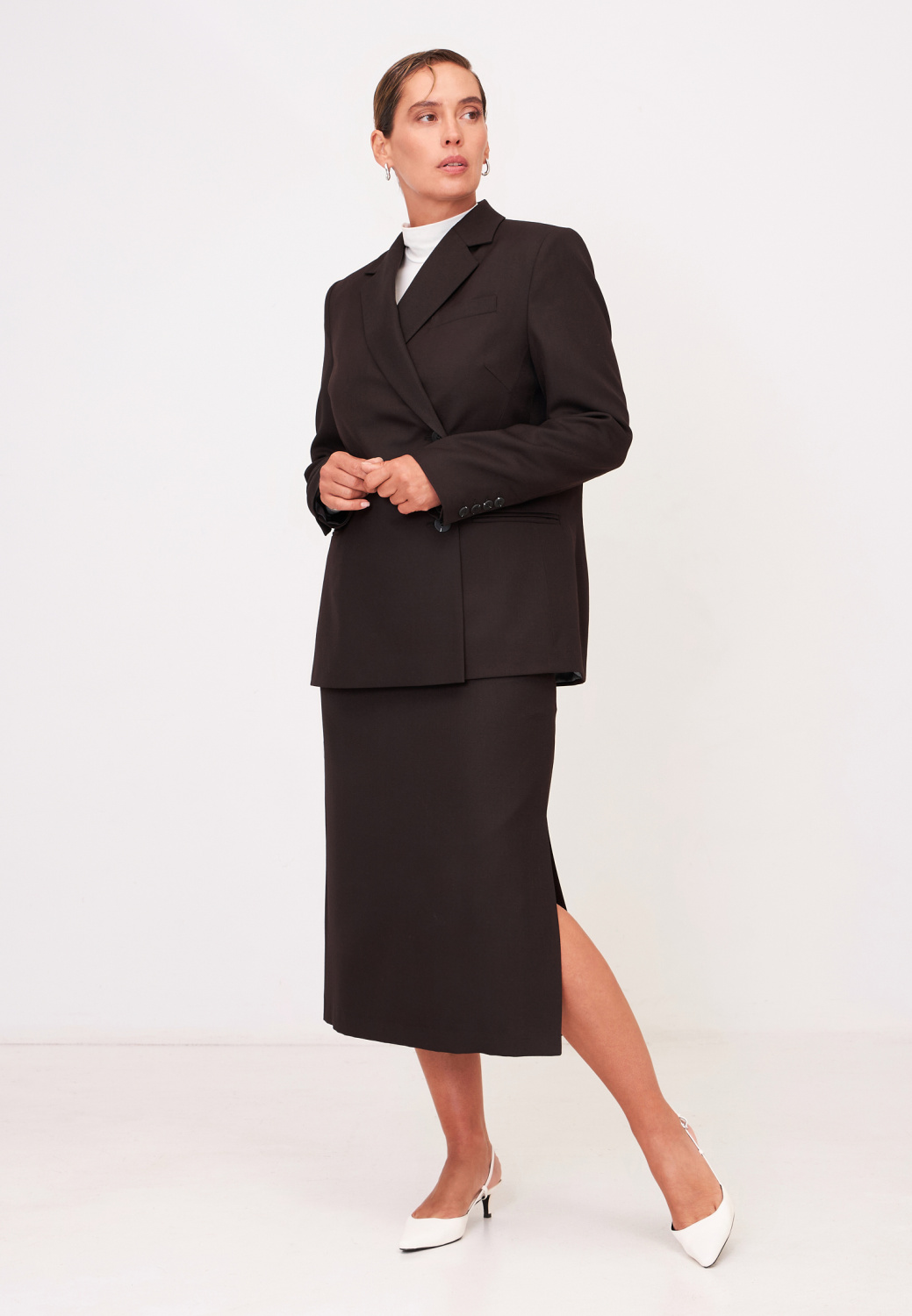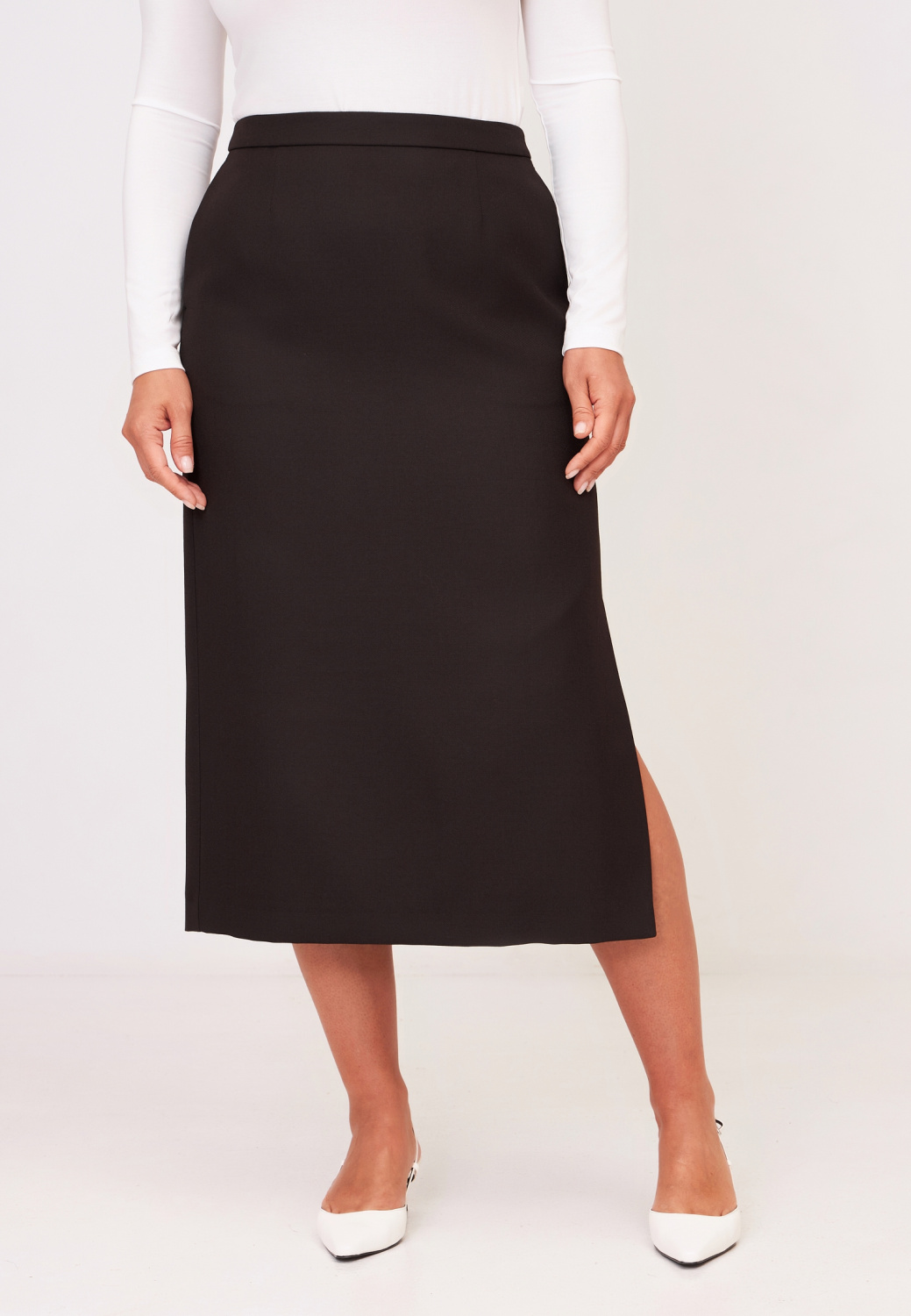 Среди огромного множества фасонов привлекает внимание юбка с боковым разрезом. Такая незначительная деталь декора способна перевоплотить образ, добавить сексуальность и эпатаж.Составит однотонный тотал-лук с пиджаком того же оттенка.