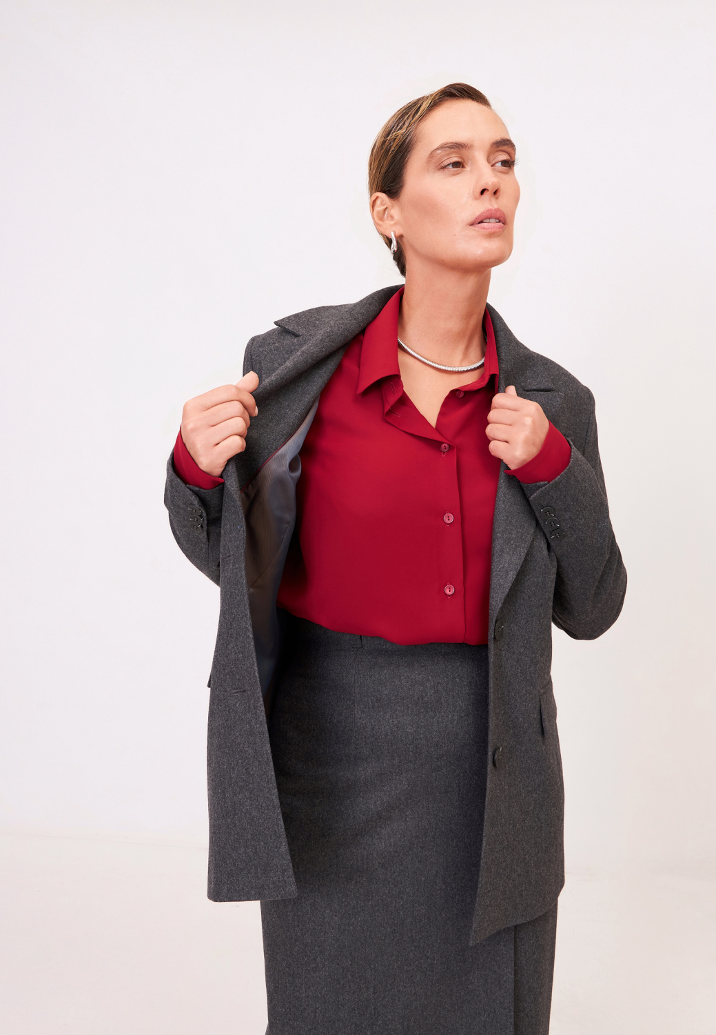 Классический жакет полуприлегающего силуэта подойдет как для формальных встреч, так и для создания повседневных образов. Незаменимая классика будет сочетаться с любым верхом: базовыми рубашками, атласными топами или трикотажными водолазками. Дополнить модель можно юбкой из комплекта.